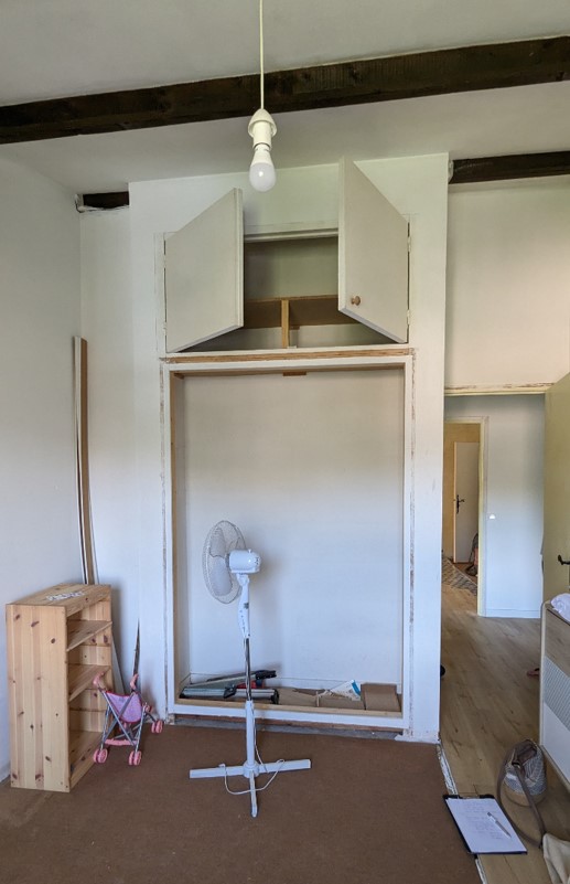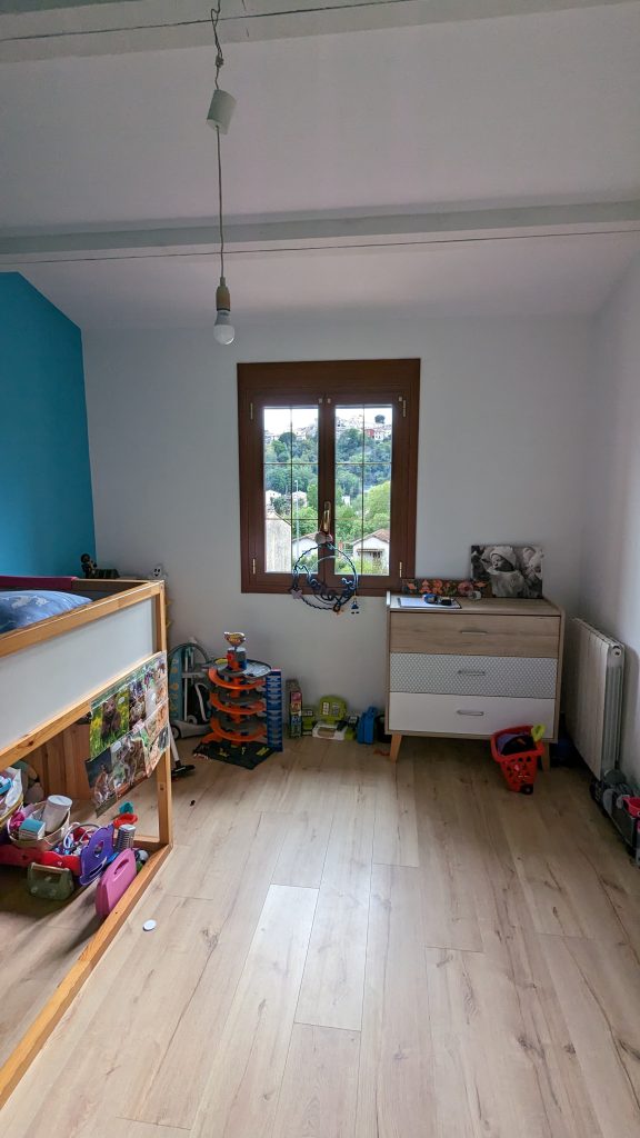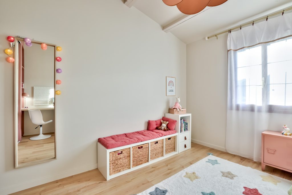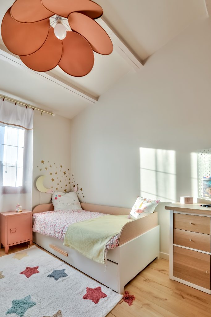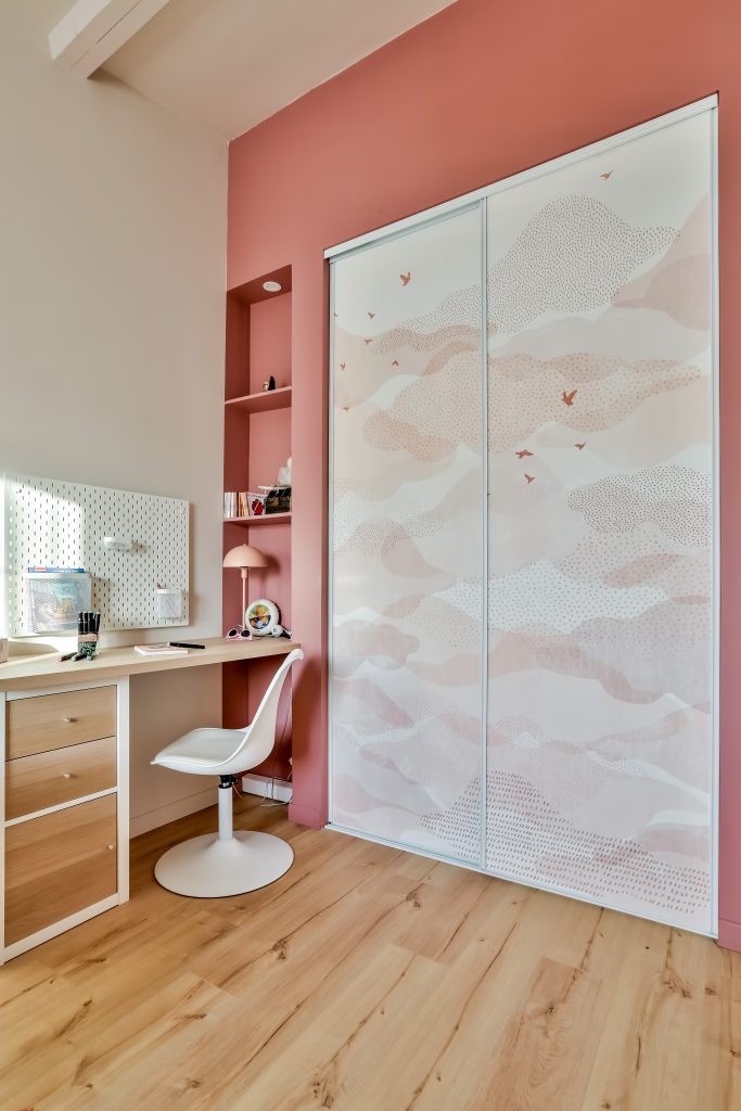 Le cahier des charges défini par la pétillante petite Louise était d’avoir une chambre girly avec du rose, des licornes, des arcs en ciel, des nuages et des étoiles. L’impératif souhaité par la maman était quand à lui, de permettre à Louise de grandir dans cette chambre sans avoir à changer toute la décoration. Dans cette chambre féerique, les murs sont délicatement peints en beige rosé poudré et vieux rose, créant une atmosphère douce et apaisante. L’espace entrée et placard est délimité par la teinte vieux rose créant une profondeur. Les portes du placard sont recouvertes d’un papier peint onirique. Cette chambre est un véritable cocon de douceur et de magie, où chaque détail est pensé pour éveiller l’imagination et faire briller les yeux de sa petite habitante.