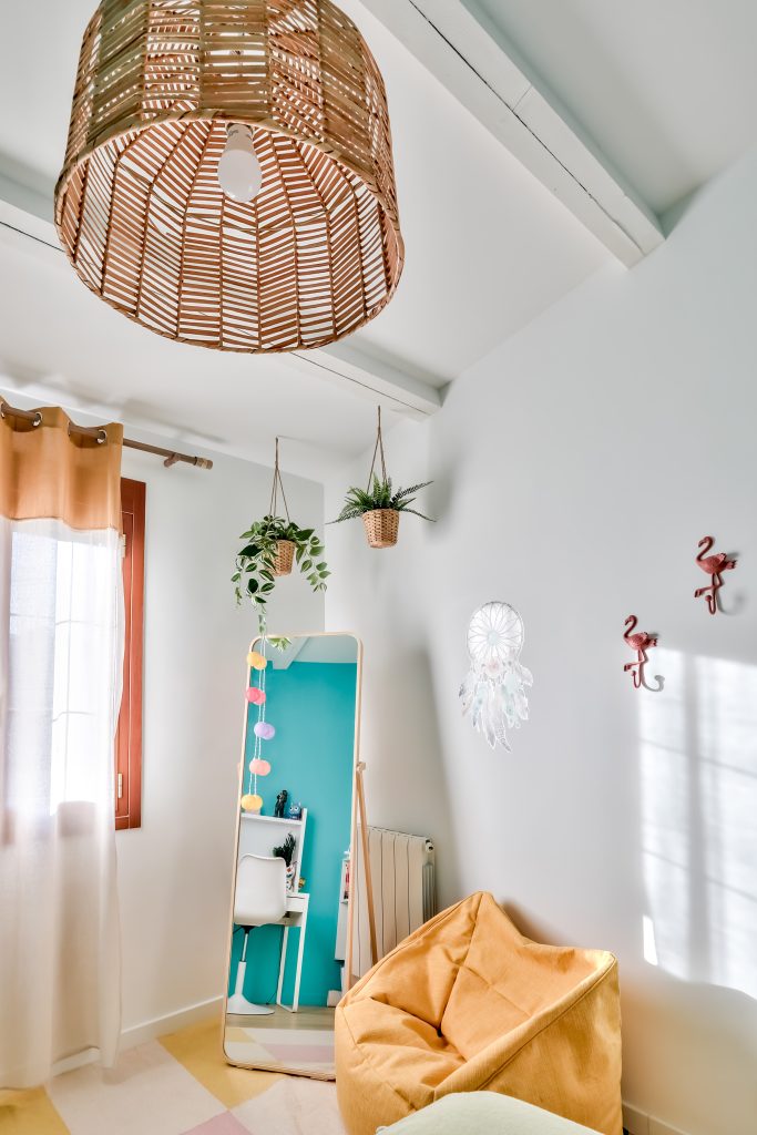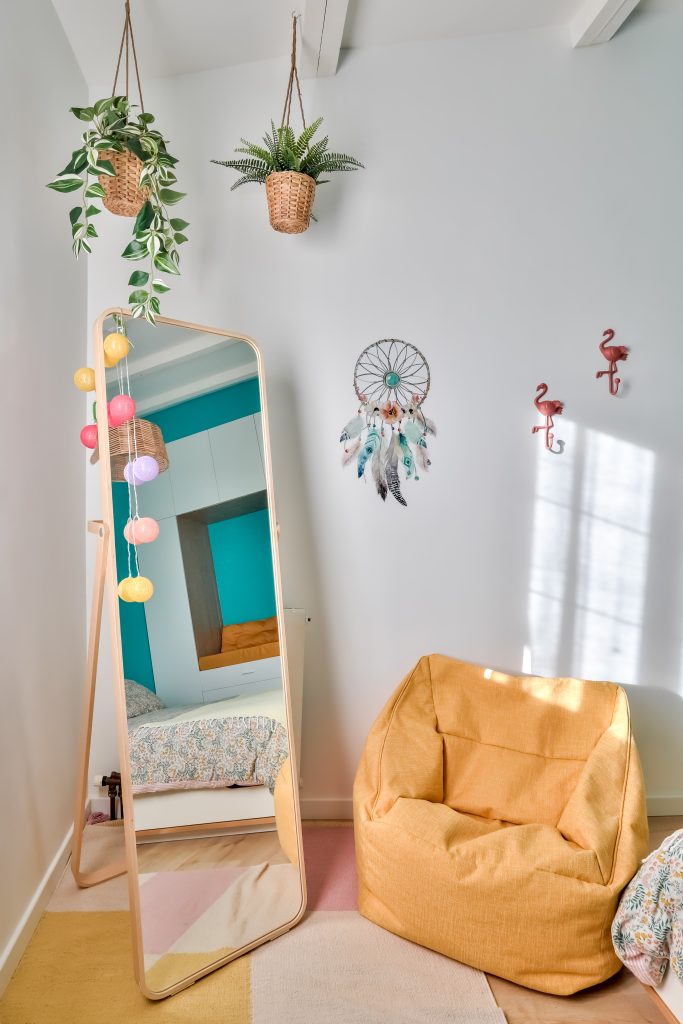 Le cahier des charges comprenait certaines contraintes, telles que conserver la couleur turquoise existante sur 2 pans de murs et s’adapter à l’assise moutarde présente dans l’alcôve. La jeune Margot voulait une chambre cocooning avec des plantes, des flamands rose, un espace de travail ainsi qu’un espace détente. L’association de couleurs vives et douces, le parquet chêne clair offrent une ambiance à la fois rafraichissante, exotique et estivale. Les plantes suspendues et le luminaire en rotin complètent l’atmosphère naturelle et apaisante. Le tapis aux couleurs douces, le miroir, et la pouf moutarde rappelant l’assise dans l’alcôve permettent à Margot de pouvoir danser et écouter de la musique librement dans sa chambre.Les affiches et les patères Flamant rose ajoutent une touche décorative colorée à cette pièce lumineuse.